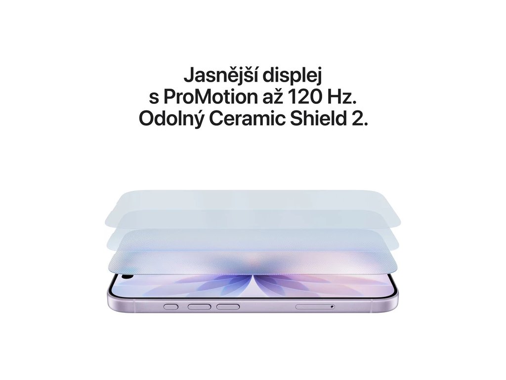 Seznam se s novým iPhonem 17. Má zaoblené hrany, tenčí okraje a je vyrobený z odolných materiálů, jako je Ceramic Shield 2 na přední straně. Takže vypadá a dlouho bude vypadat skvěle. Na 6,3palcovém Super Retina XDR displeji uvidíš a uděláš ještě víc věcí, co tě baví. A díky ProMotion s adaptivní obnovovací frekvencí až 120 Hz si užiješ plynulejší skrolování a hry tě pohltí jako nikdy. Podívej, jak se umí otáčet.