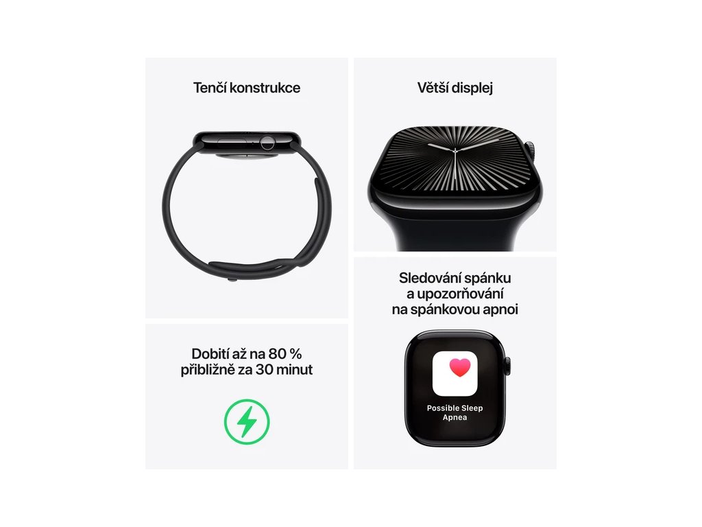 Series 10 představují zásadní milník pro Apple Watch. Mají náš zatím největší a nejvyspělejší displej, na kterém toho uvidíš ještě víc než dřív. Je to první OLED displej Apple s širokým pozorovacím úhlem. Výrazně jasnější a čitelnější i při letmém pohledu ze strany.