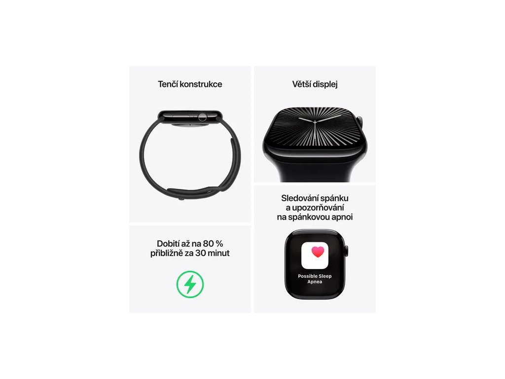 Series 10 představují zásadní milník pro Apple Watch. Mají náš zatím největší a nejvyspělejší displej, na kterém toho uvidíš ještě víc než dřív. Je to první OLED displej Apple s širokým pozorovacím úhlem. Výrazně jasnější a čitelnější i při letmém pohledu ze strany.