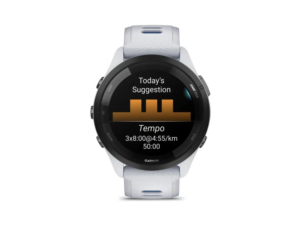 Forerunner 265 nabízí širokou škálu tréninkových funkcí, včetně monitorování srdečního tepu, VO2 max, tréninkové zátěže a doporučení pro regeneraci. Díky podpoře více než 30 sportovních aktivit můžete sledovat svůj výkon v různých disciplínách. Funkce Training Readiness poskytuje skóre připravenosti na trénink na základě faktorů, jako je kvalita spánku, regenerace a zátěž, což pomáhá optimalizovat váš tréninkový plán.